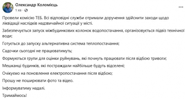 "Провели комісію техногенно-екологічної безпеки та надзвичайних ситуацій. Всі відповідні служби отримали доручення здійснити заходи щодо ліквідації наслідків надзвичайної ситуації у місті. Забезпечується запуск міжбудинкових колонок водопостачання, організовується підвіз технічної води. Готується до запуску альтернативна система теплопостачання. Садочки сьогодні не працюватимуть. Формуються групи для оцінки руйнувань, які почнуть працювати після відбою тривоги. Мешканці будинків, які постраждали найбільше будуть відселені. Очікуємо на поновлення електропостачання після відбою. Прошу не поширювати фото та відео. Інформуватиму надалі. Тримаймось!"
