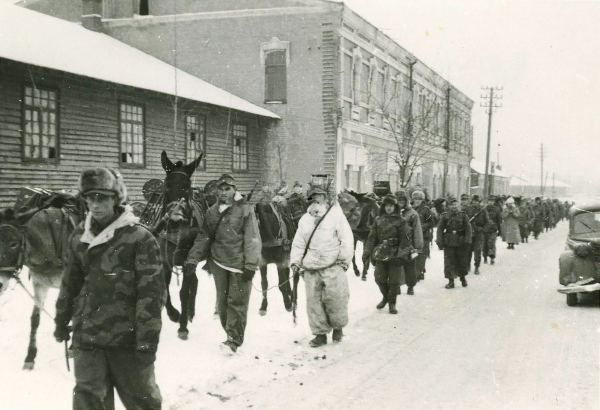 Як стверджує продавець, на фото зображено Вінницю в 1944 році. Підозрюю, що в кадр потрапила будівля, яка з 1944 по 1952 роки тимчасово виконувала функцію вінницького вокзалу (потім там був суд, а тепер на місці цього будинку спорудили торговий центр "Smile City"). Якщо моє припущення вірне, колона рухається теперішньою вулицею Батозькою від Коцюбинського в сторону Хімзаводу.