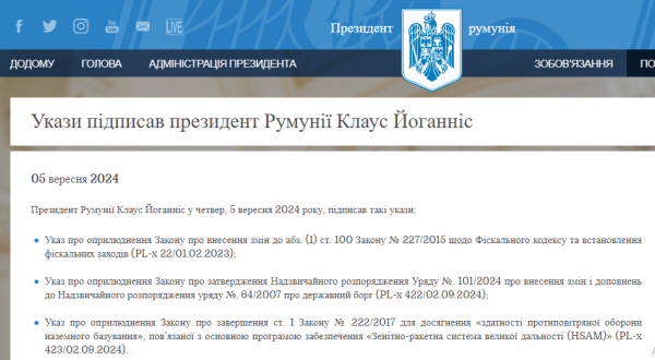 Відповідний закон підписав президент Румунії Клаус Йоганніс у четвер, 5 вересня. Румунія вирішила передати одну з двох своїх діючих систем Patriot Україні за умови, що союзники пізніше замінять її на іншу таку систему.